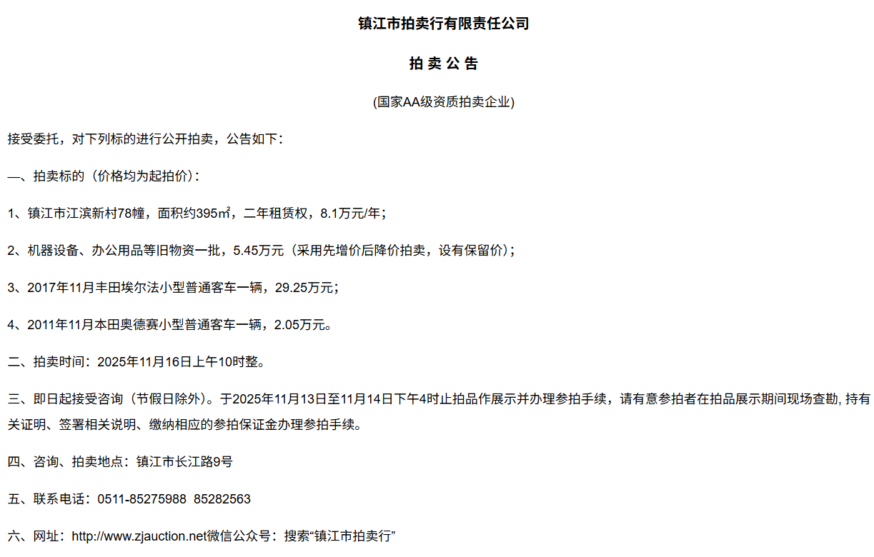 鎮江市拍賣行有限責任公司拍 租 公 吿(國家AA級資質拍賣企業)接受委托,對下列標的進行公開拍租(三拍),公告如下:—、拍租標的(以下價格均為半年至3年租賃權起拍價):1.  建行揚中豐裕支行營業網點二、三、四層經營用房(揚中市三茅鎮三豐南路5號),租賃面積約1080㎡,每層面積約360㎡,三拍底價11.98萬/年(0.3元/平方米/天)。2.  建行揚中油坊支行營業網點三、四層經營用房(揚中市油坊鎮太陽路129號),租賃面積約590㎡,每層面積約295㎡,三拍底價5.34萬/年(0.25元/平方米/天)。3. 建行揚中八橋支行營業網點三、四層經營用房(揚中市八橋鎮太平北路29號),租賃  面積約400㎡,三層約185㎡,四層約215㎡,三拍底價4.43萬/年(0.25元/平方米/天)。以上3套房產均可分層部分出租,拍租價=拍租面積*每平方米每天的租賃單價4. 建行鎮江團山路支行營業網點一層經營用房(鎮江市檀山路8號60幢102、103室),租賃面積約597.09㎡,三拍底價34.52萬/年。5. 建行丹陽原賢橋分理處營業用房(丹陽市城河路15-21號),租賃面積約93.88㎡,二拍底價7.16萬/年。二、拍租時間:2025年11月23日上午10時整。三、即日起接受咨詢(節假日除外)。于11月17日至11月21日下午4時止拍品作展示并辦理參拍手續,請有意參拍者在拍品展示期間現場查勘,持有關證明、簽署相關說明、繳納相應的參拍保證金辦理參拍手續。四、咨詢、拍租地點:鎮江市長江路9號五、聯系方式:0511-85275988   13655299933楊先生六、網址:http://www_zjauction_net.drbwcl.cn;微信公眾號:搜索“鎮江市拍賣行” 拍品清單2025.11.23序號名稱起拍價(元)標的說明1建行揚中豐裕支行營業網點二、三、四層經營用房(揚中市三茅鎮三豐南路5號),租賃面積約1080㎡,每層面積約360㎡三拍底價11.98萬/年(0.3元/平方米/天)1、1-3號房產均可分層部分出租,拍租價=拍租面積*每平方米每天的租賃單價;2、意向競拍人在拍賣前需持營業執照或身份證與委托方說明租賃房產經營業態,確定意向后出具房產承租用途承諾書,經委托方審核后,方可交納保證金參加競拍;3、租賃期限為半年至3年(承租方與出租方協商而定),承租方每半年或一年結付租金,租賃期間的水、電費用及其它相關費用均由承租方承擔;4、承租方不得用于經營和保管危險物品,不得用于開設餐飲、娛樂等可能嚴重影響消防安全、運營安全的經營業態,不得用于經營委托貸款、小額貸款等可能冒用委托方名義,帶來聲譽風險的經營業態。租賃期內,承租方不得破壞墻體結構,自行成就消防、安全等使用條件,不得擅自將租賃房屋轉租、轉讓給他人使用,否則委托方有權收回房屋;5、拍租成交后,承租方將租金交至出租方指定賬戶,傭金交至拍賣方賬戶(拍租傭金為該房屋一個月租金)。承租方憑租賃合同無息退還保證金。2建行揚中油坊支行營業網點三、四層經營用房(揚中市油坊鎮太陽路129號),租賃面積約590㎡,每層面積約295㎡三拍底價5.34萬/年(0.25元/平方米/天)3建行揚中八橋支行營業網點三、四層經營用房(揚中市八橋鎮太平北路29號),租賃面積約490㎡,每層面積約245㎡三拍底價4.43萬/年(0.25元/平方米/天)4建行鎮江團山路支行營業網點一層經營用房(鎮江市檀山路8號60幢102、103室),建筑面積約597.09㎡三拍底價34.52萬/年5建行丹陽原賢橋分理處營業用房(丹陽市城河路15-21號),建筑面積約93.88㎡二拍底價7.16萬/年